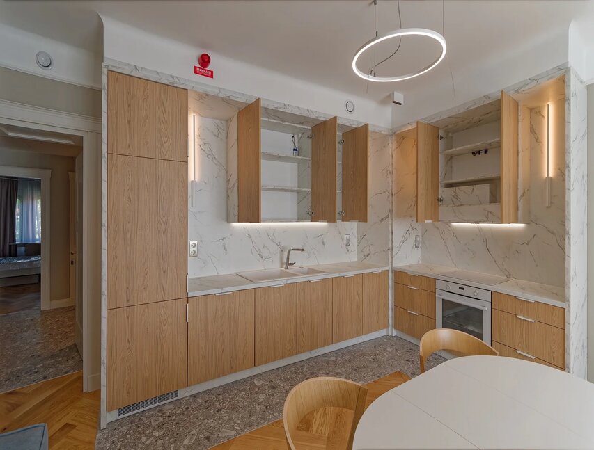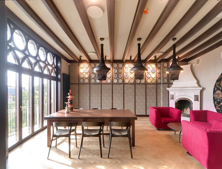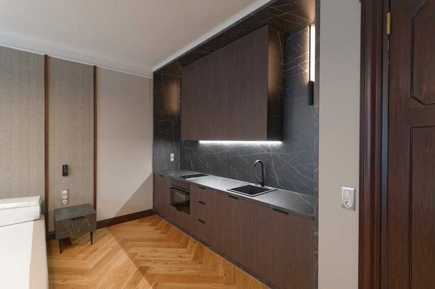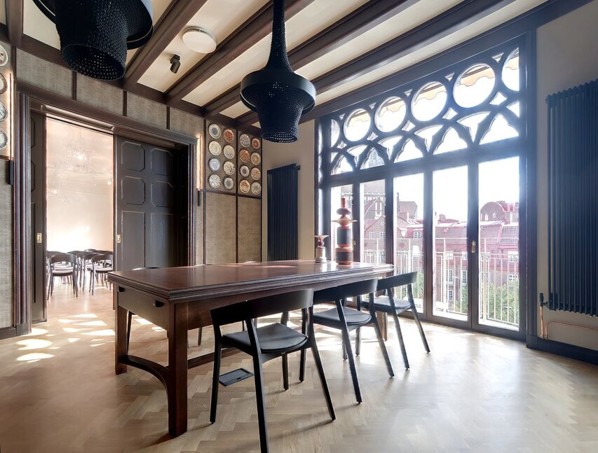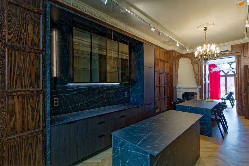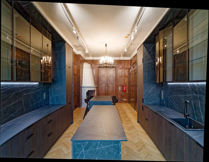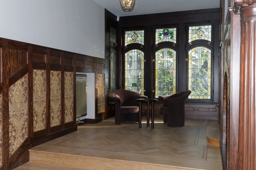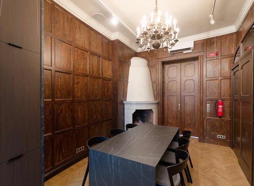 Wykonanie mebli nowych oraz innych elementów wyposażenia wnętrz: parkiety, boazerie, renowacja mebli historycznych.