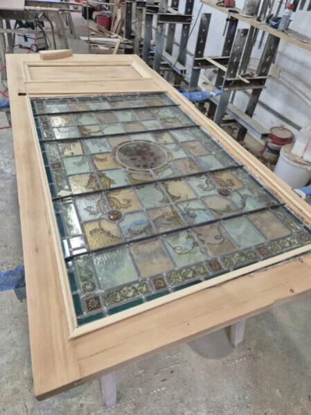 Kolejne drzwi z kolorowymi szkiełkami właśnie nabierają blasku na naszym stole renowacyjnym.